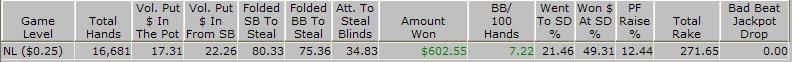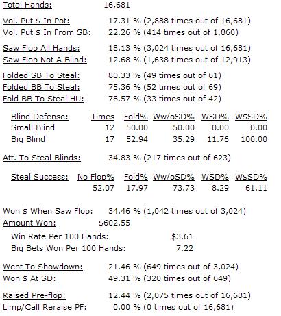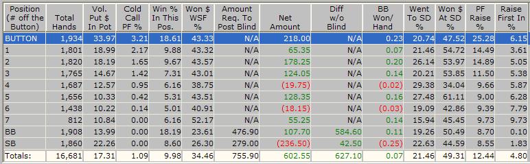 The two biggest changes were probably a lot less folding postflop with TPTK and overpairs, and my button play (check out the position stats). My hand reading skills have also improved quite a lot.
