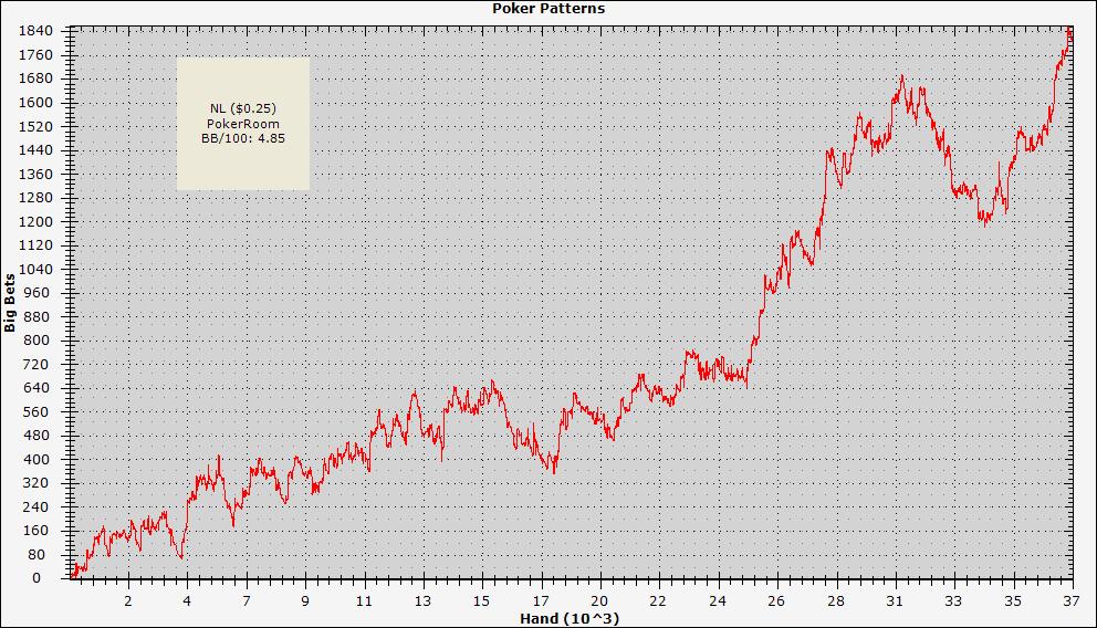 I've included the last two months in the Poker Patterns graph. You can see the moment I changed my strategy around 25000 hands. The big downswing was variance from hell, with 5 or 6 sets losing to oversets or straights. This was followed by almost equal positive variance, a big chunk of which wasn't caught by PokerTracker ($80/120 hands).
